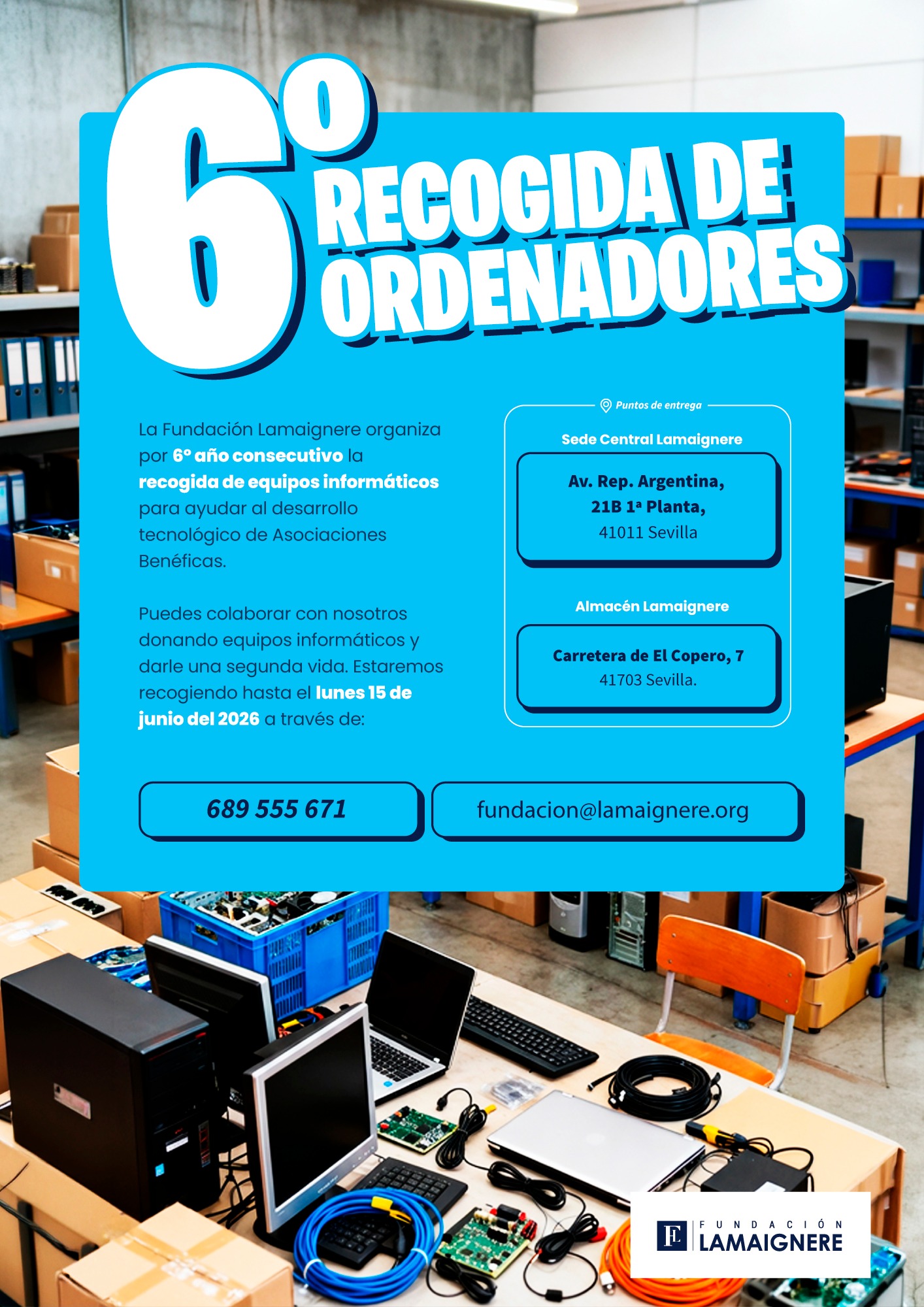 La Fundación Lamaignere organiza por sexto año consecutivo la recogida de equipos informáticos con la inestimable colaboración de Segurapi Mensajeros. El objetivo de esta acción social es poder ayudar al desarrollo tecnológico de Asociaciones Benéficas. Para aquellas personas y empresas que deseen colaborar, pueden contactar con nosotros donando equipos informáticos en buen estado hasta el lunes 15 de junio.